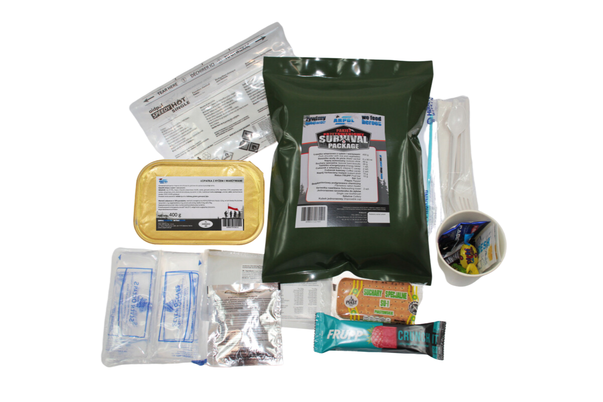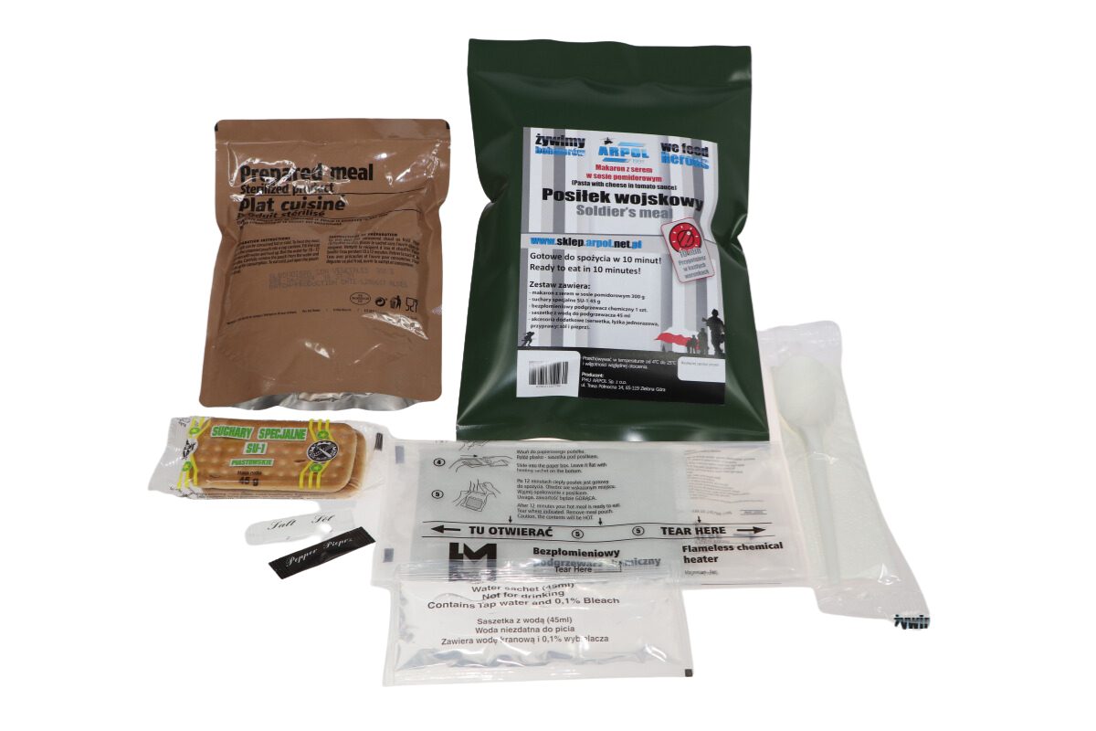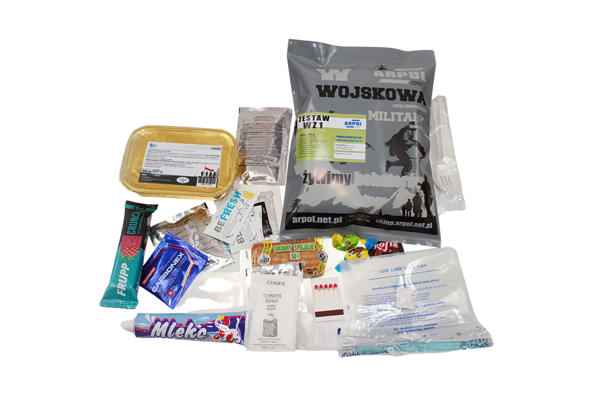 Racja żywnościowa wojskowa WSH Rodzaje zestawów:WSH 1 kurczak z ryżem i soczewicą WSH 2 gulasz z fasolą i kiełbaską WSH 3 makaron po bolońsku Racja żywnościowa wojskowa WZ Rodzaje zestawów:WZ 1 lazania WZ 2 bogracz WZ 3 kurczak z ryżem WZ 4 risotto pomidorowe Pakiet Przetrwaniowy Rodzaje zestawów:PP 1 łopatka z ryżem PP 2 gulasz węgierski PP 3 spaghetti Posiłek wojskowy Rodzaje zestawów:PW 1 kurczak z fasolą i warzywami PW 2 makaron po bolońsku PW 3 paella z kurczakiem PW 4 gulasz z fasoli i kiełbasy PW 5 kurczak z warzywami hot pot PW 6 makaron carbonara PW 7 kurczak z ryżem i soczewicą PW 8 klopsiki z makaronem Racja wojskowa W Rodzaje zestawów:W 1 gulasz drobiowy W 2 pulpety w s. warzywnym W 3 leczo z kiełbasą Pakiet bushcraft PBC Rodzaje zestawów:PBC 1 filet z indyka PBC 2 bogracz PBC 3 kiełbasa z pomidorami PBC 4 łazanki z kapustą Pakiet Prepersa